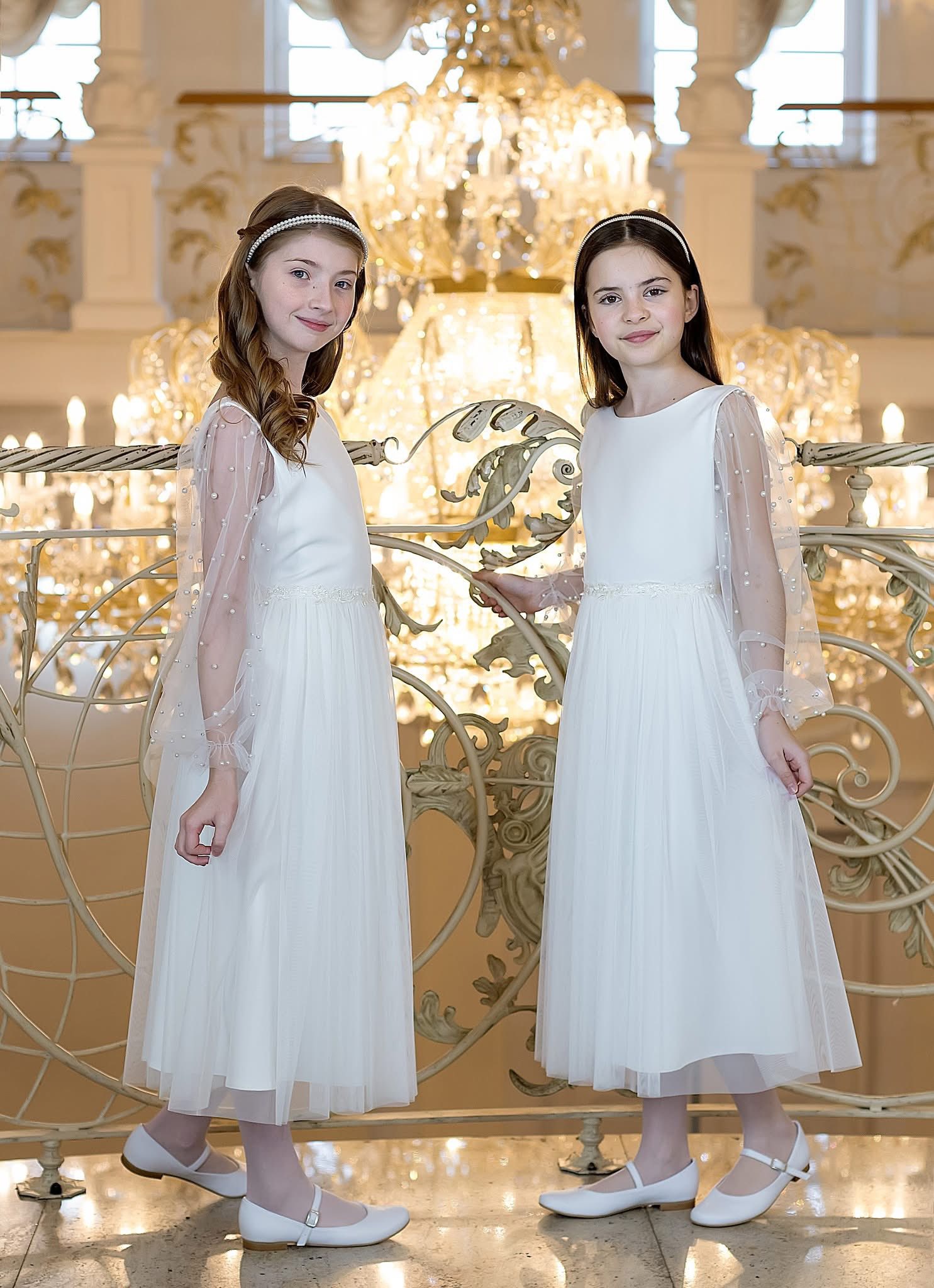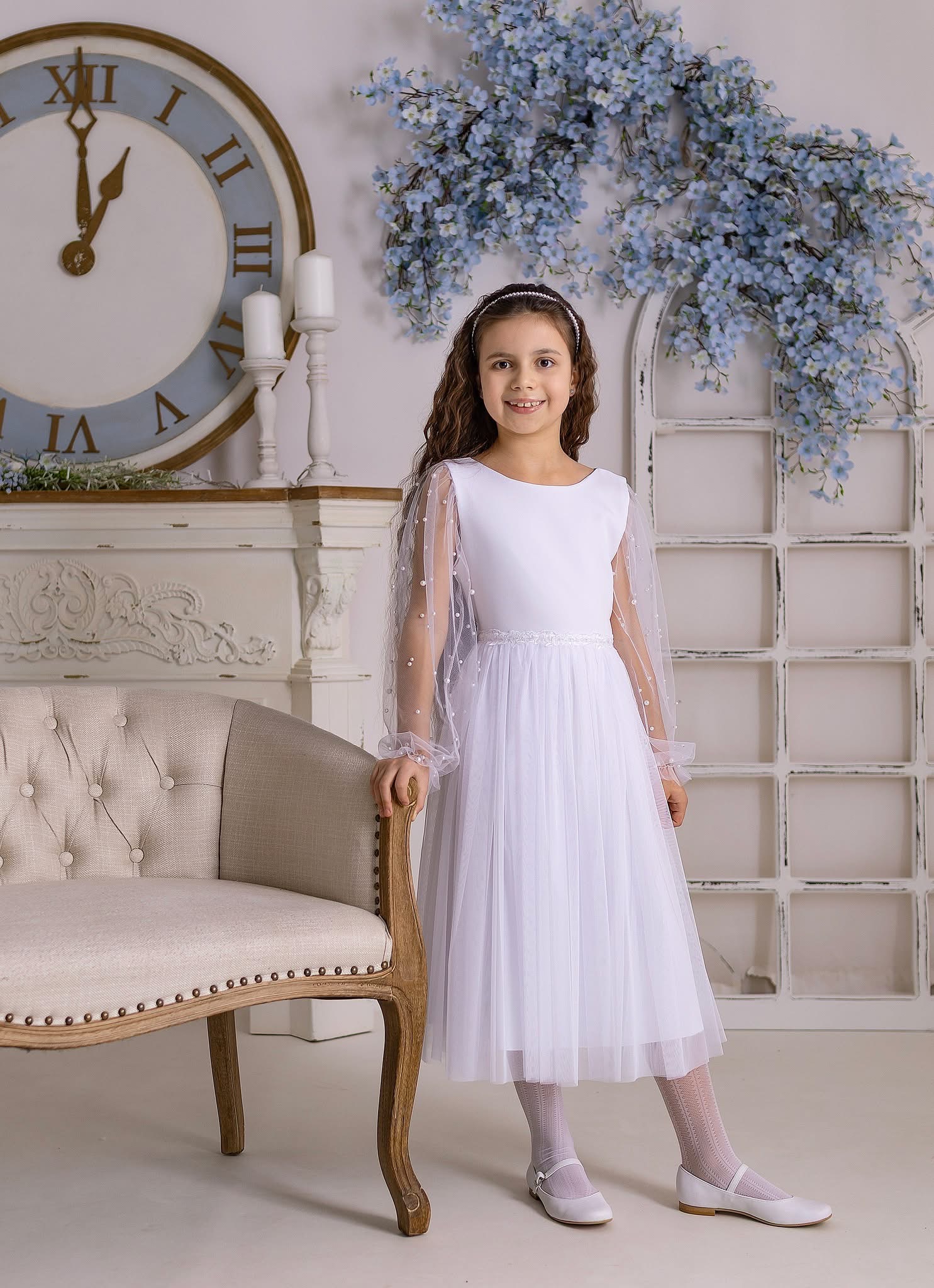 Elegancka sukienka dziewczęca w klasycznym kolorze ecru  – idealna na wyjątkowe okazje, takie jak uroczystości rodzinne, przyjęcia czy komunie. Sukienka posiada delikatne, tiulowe rękawy ozdobione subtelnymi perełkami oraz lekko rozkloszowany dół z tiulu, który pięknie układa się podczas ruchu. Dodatkowym urokiem jest tiulowa kokarda wiązana z tyłu, nadająca całości wyjątkowo dziewczęcego i eleganckiego charakteru. ✨